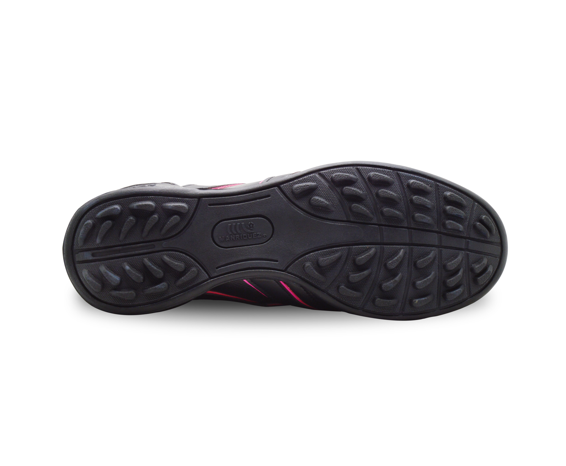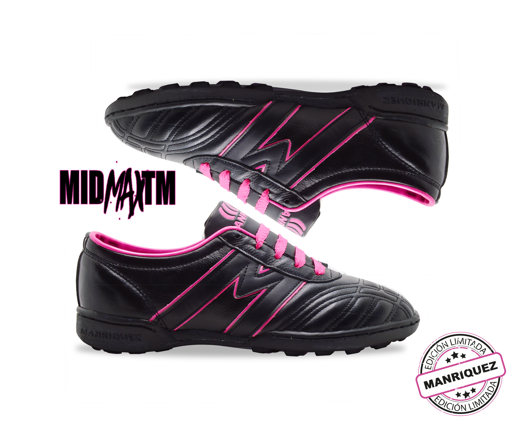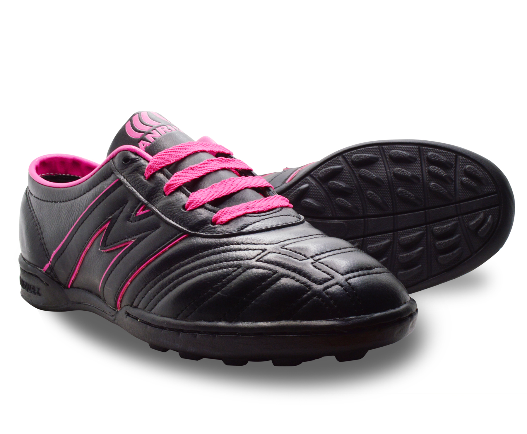 Tenis de fútbol fabricado con corte 100% piel de bovino color blanco con aplicaciones de material sintético negro y verde, suela multitaco recomendada para su uso en canchas de pasto sintético.
