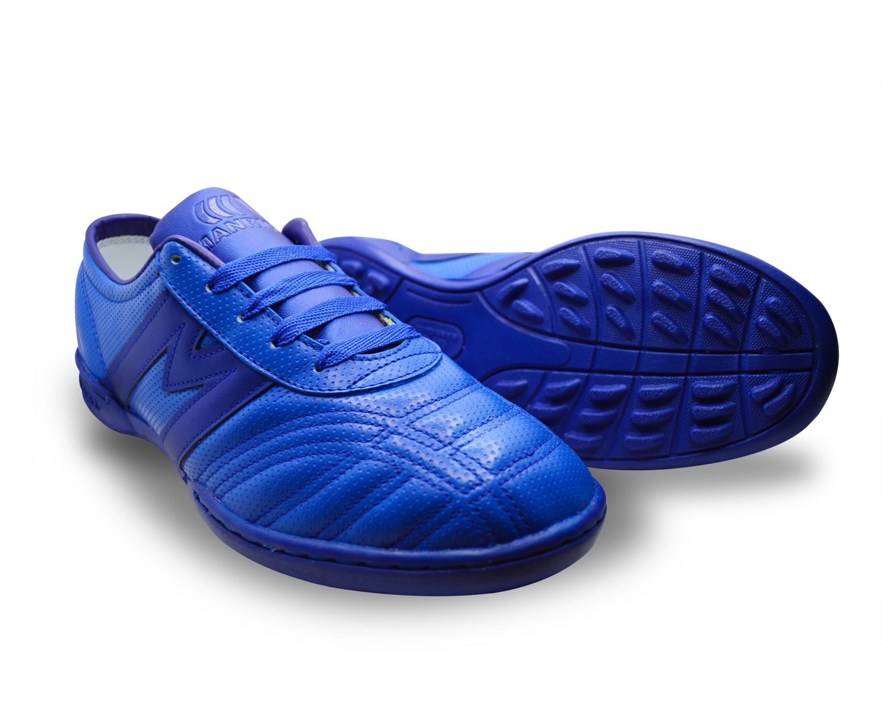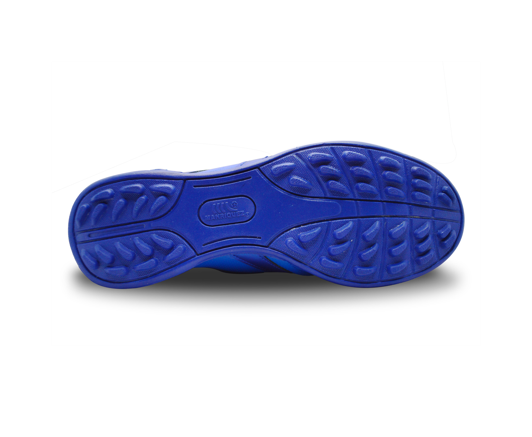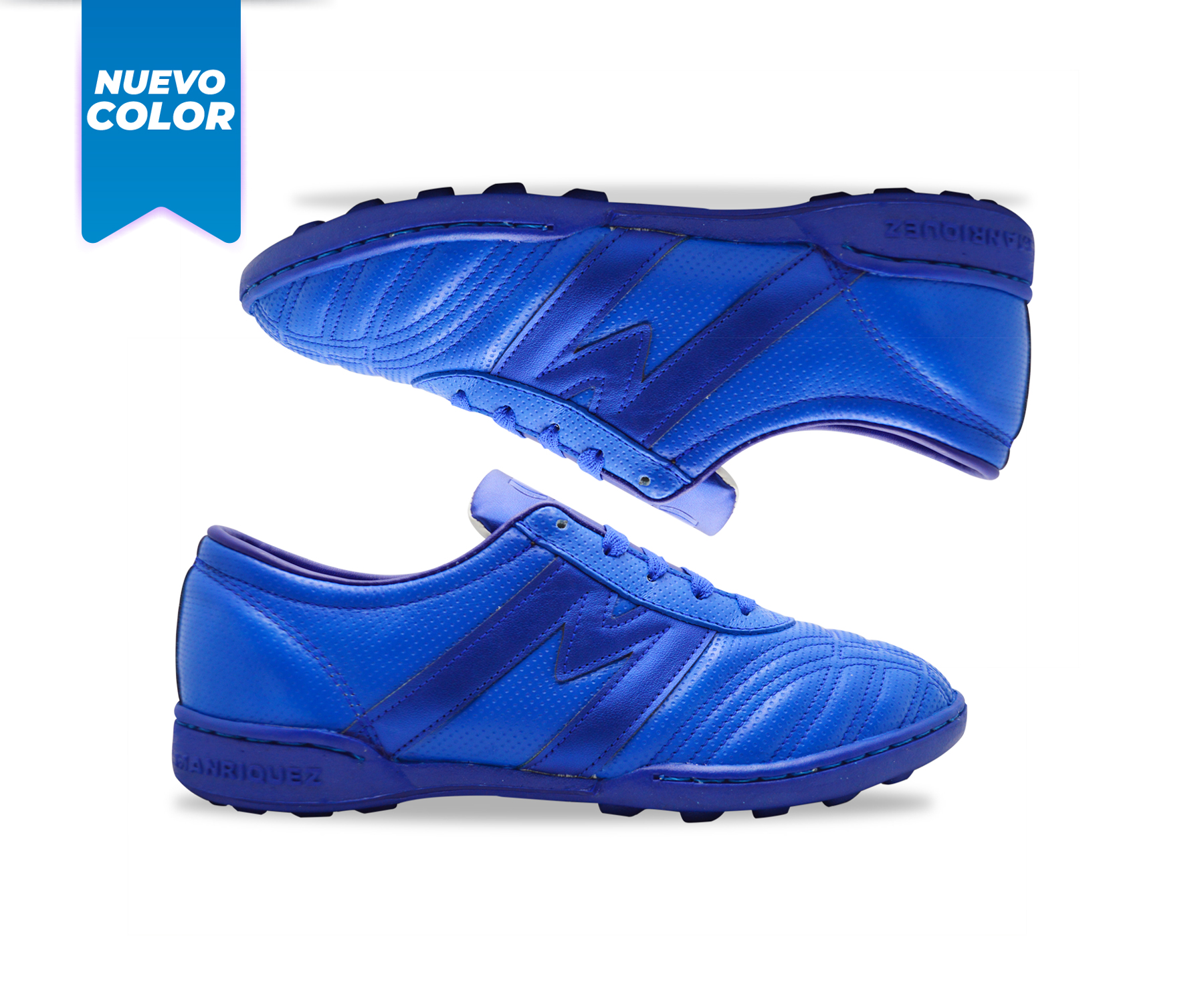 Tenis de fútbol fabricado con corte 100% piel de bovino con grabado tipo perforado color azul rey y aplicaciones de material sintético del mismo color, suela multitaco recomendada para su uso en canchas de pasto sintético.